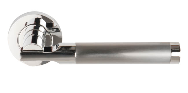 This Seriphos lever on round rose comes in a polished chrome / satin chrome finish.