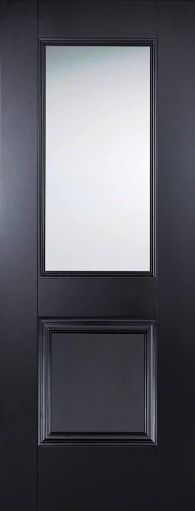 The Internal Arnhem Door comes from our black door collection and is primed with a double coat, ready for a final finish. This particular design features 2 panels, the top panel is glazed using clear toughened glass to allow light to travel through. Constructed with a solid core and black primed plus, this door allows trimming of Up to 6mm from any edge.