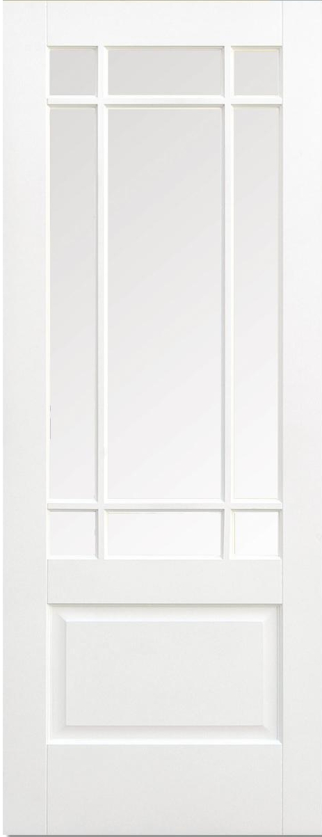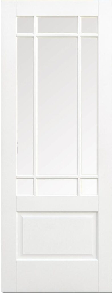 Elevate your interior with the Downham Internal White Primed door, where clear bevelled glazed panels adorned with decorative bars take centre stage.