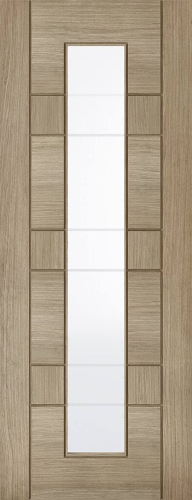 In a pre-finished Light Grey, the Edmonton features V Cut grooves in a modern, ladder style effect. This door has a cool and contempoary design and colour and will look perfect in a modern home. Featuring a long, vertical clear glazed with frosted lines panel, this the Edmonton is great for letting in some light to your home.