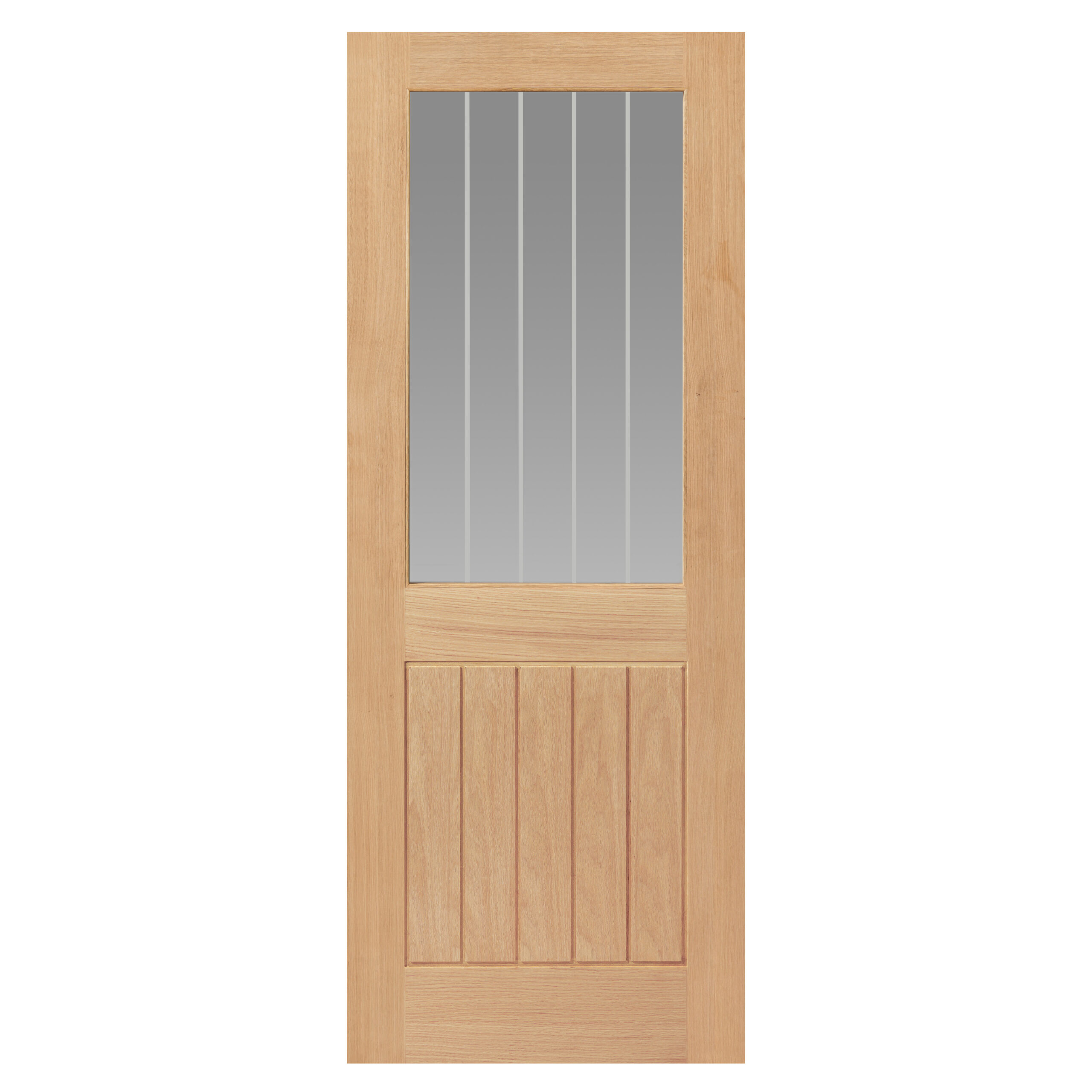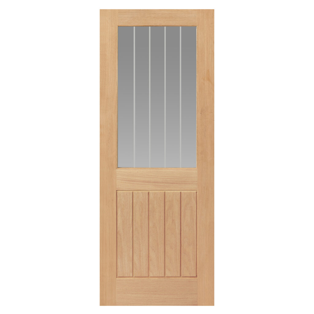 An Oak glazed internal with etched glass, the Thames Oak Half Light door will allow natural light to flood into your home. The etched glass and centre panel with vertical grooves, provide the look of a cottage door and rustic charm. This interior door is supplied unfinished, ready for the finish of your choice.