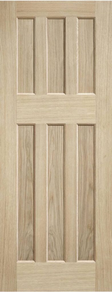 This 60’s style door design features six rectangular shaped inset panels in a beautiful unfinished Oak wood.