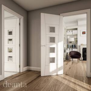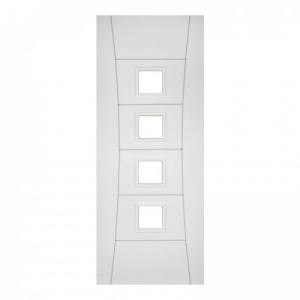 This unique door combines a clever combination of lines and curves. The perfectly spaced horizontal lines are strikingly accentuated by the gentle vertical curves. In the glazed door, four square panes of clear toughened glass are set neatly between the vertical lines.