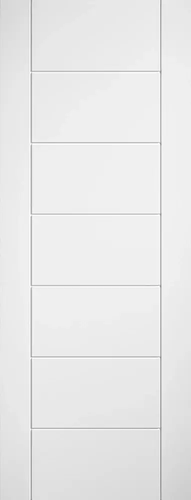 This white primed 7-panel door features a sleek, modern design, making it a versatile addition to any contemporary space. The door is perfect for residential or commercial use, providing a fresh, minimalist look while maintaining durability and ease of maintenance. Primed and ready for painting, it allows customization to fit any interior design. Whether for a hallway, bedroom, or office, this door effortlessly enhances the overall aesthetic of your home or workplace.
